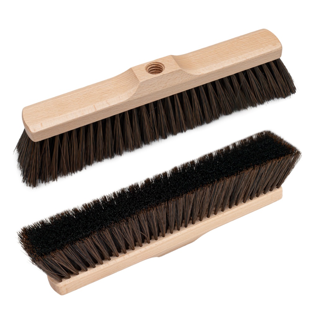 Besenkopf aus lackiertem Buchenholz mit mittelharten PET-Borsten für Staub und trockenen Schmutz. Passend für Standardstiele durch 22-mm Innengewinde. Ideal für Innenräume und Werkstatt.