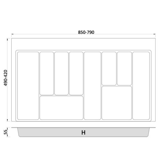 Der Besteckeinsatz Küche 90 cm ist ein universeller Schubladeneinsatz für 90-cm-Unterschränke. Dank zuschneidbarer Ränder lässt er sich präzise auf 850–790 mm Breite und 490–420 mm Tiefe anpassen. Das stabile 2-mm-Material, der rutschfeste Riffelboden sowie die klar strukturierte Fachaufteilung sorgen für optimale Raumnutzung und eine übersichtliche Organisation von Besteck und Küchenhelfern.