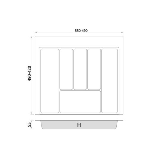 - Zuschneidbar: Breite 550–490 mm, Tiefe 490–420 mm