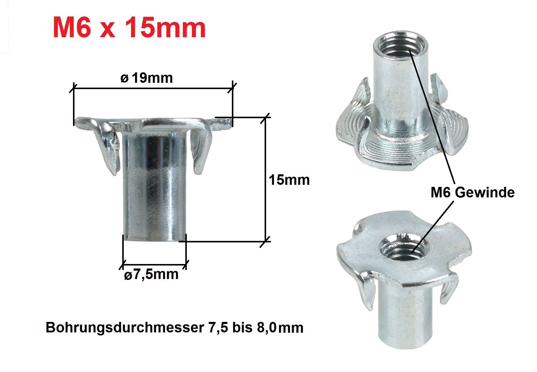 Einschlagmutter M6 x 15 mm verzinkt – 4 Einschlagspitzen – 10 oder 100 Stück