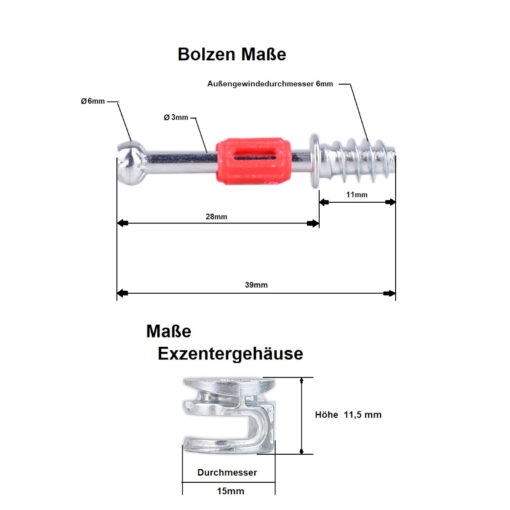 Exzenterverbinder 15 mm mit Einschraubdübel 6×11 mm – 28 mm Spannmaß – 39 mm Bolzen