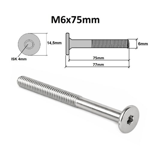 Flachkopfschrauben M6 x 75 mm mit metrischem Gewinde, flachem Kopf und Innensechskant.