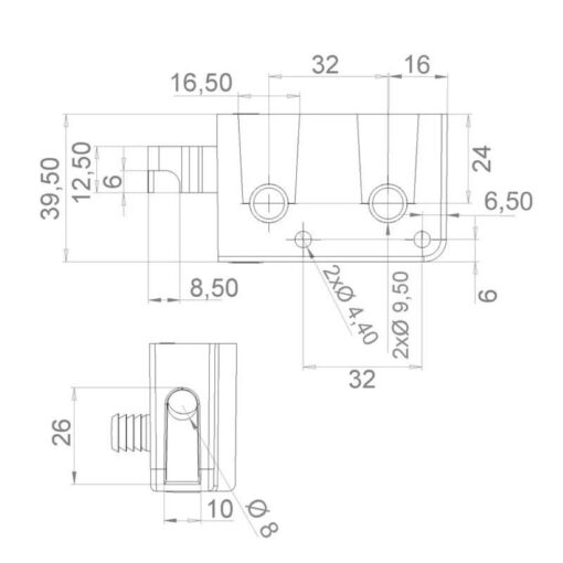 - Zapfen: Ø10 mm, Abstand 32 mm