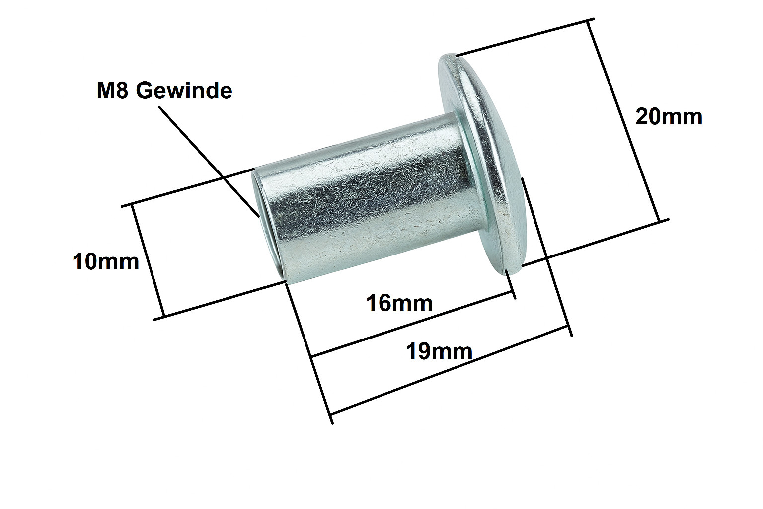 Hülsenmutter M8 x 16 mm Rundkopf Ø20 – Stahl verzinkt, Innensechskant SW5