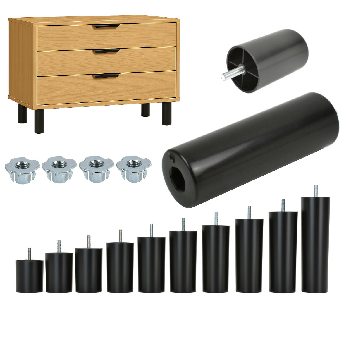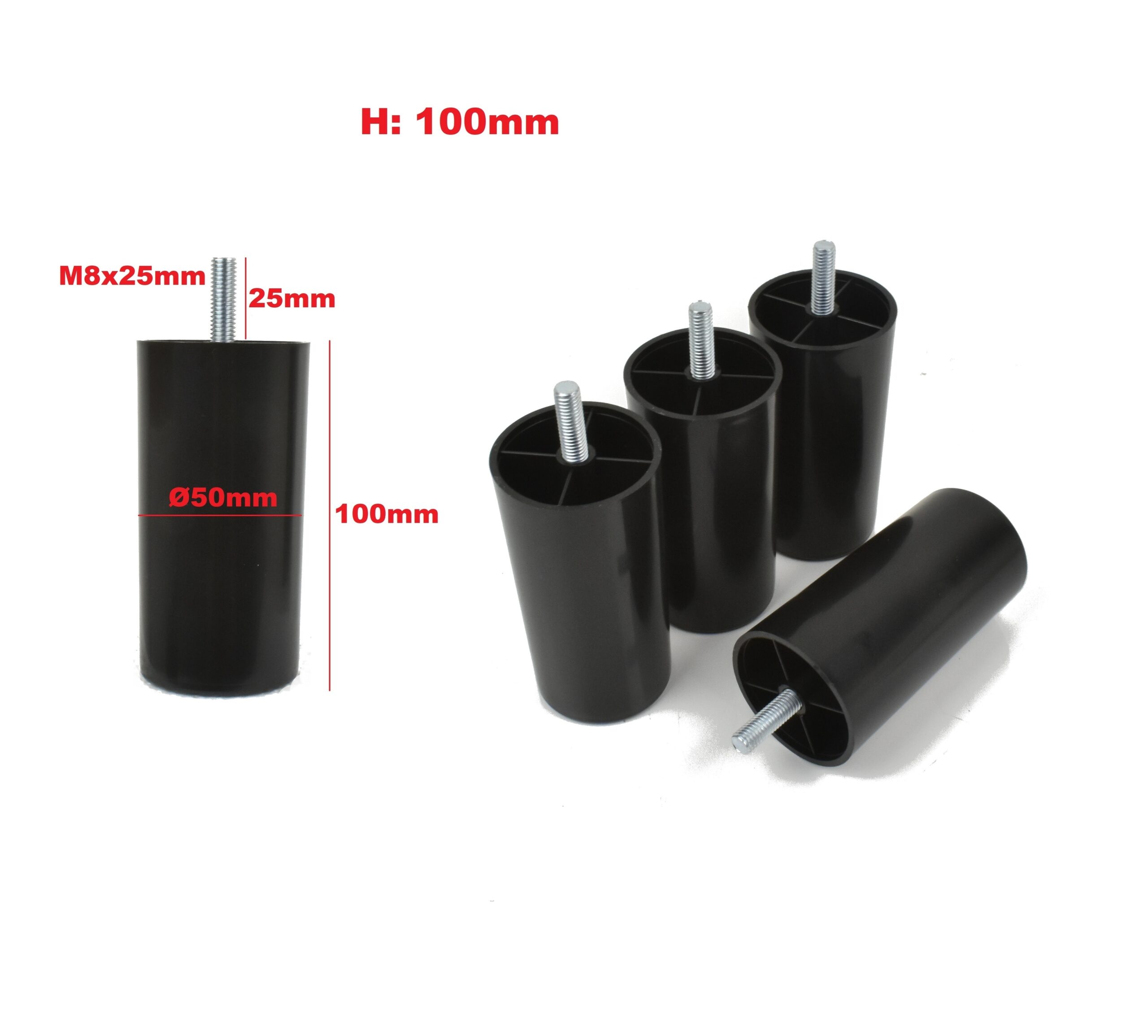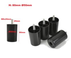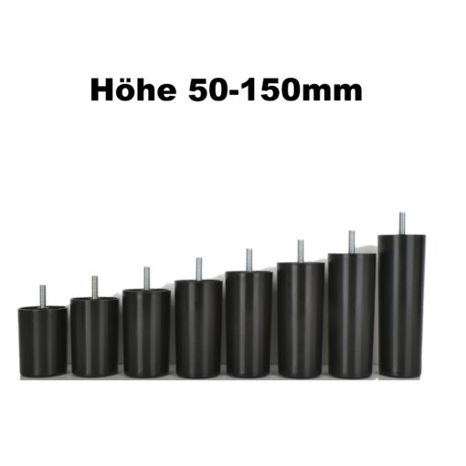 Runde Möbelbeine Ø50 mm aus schwarzem Kunststoff, jeweils mit vormontiertem M8×25 Gewindestift für die direkte Unterbodenmontage. Neun Höhen verfügbar – ideal für Sofas, Schränke, Sideboards und präzise Höhennivellierung.