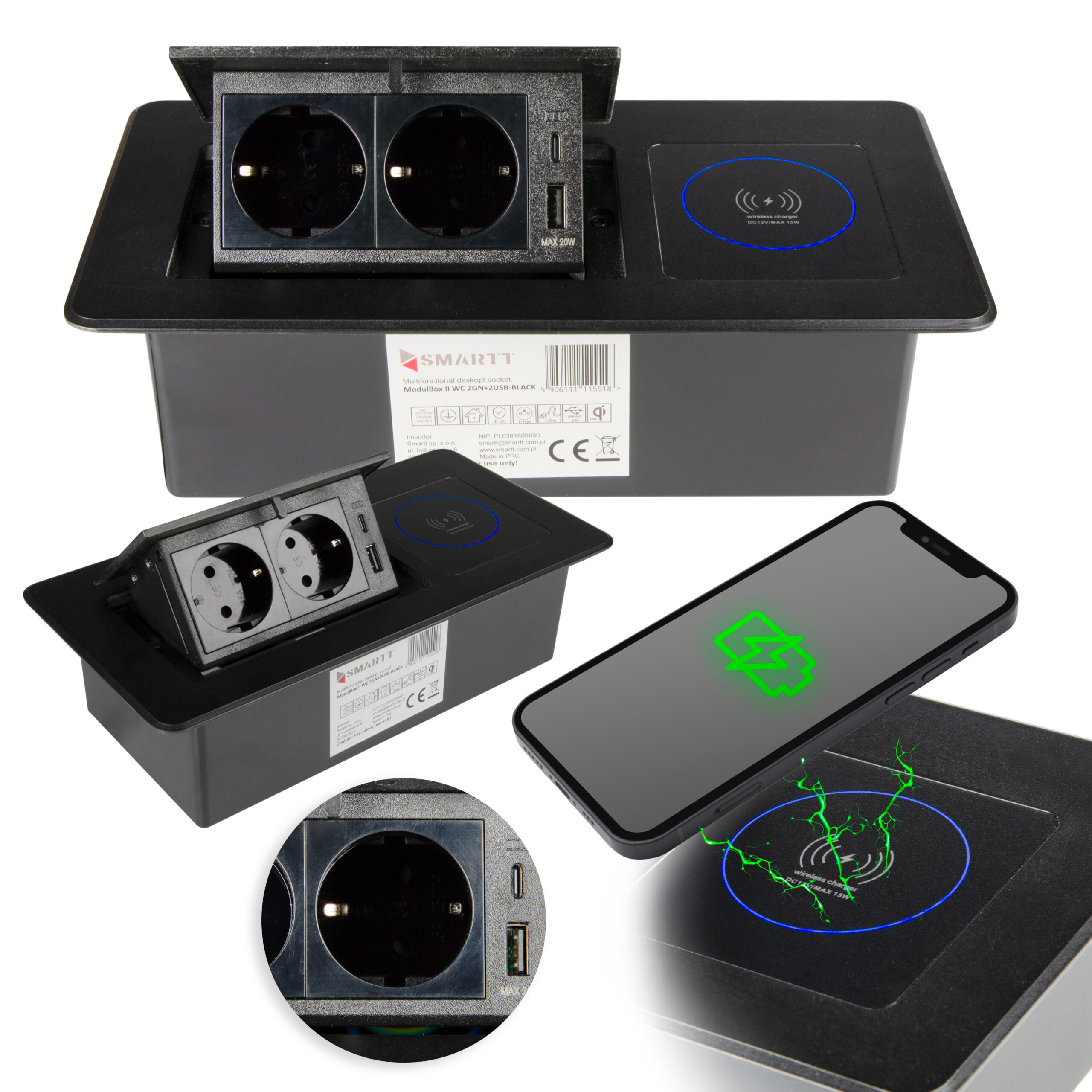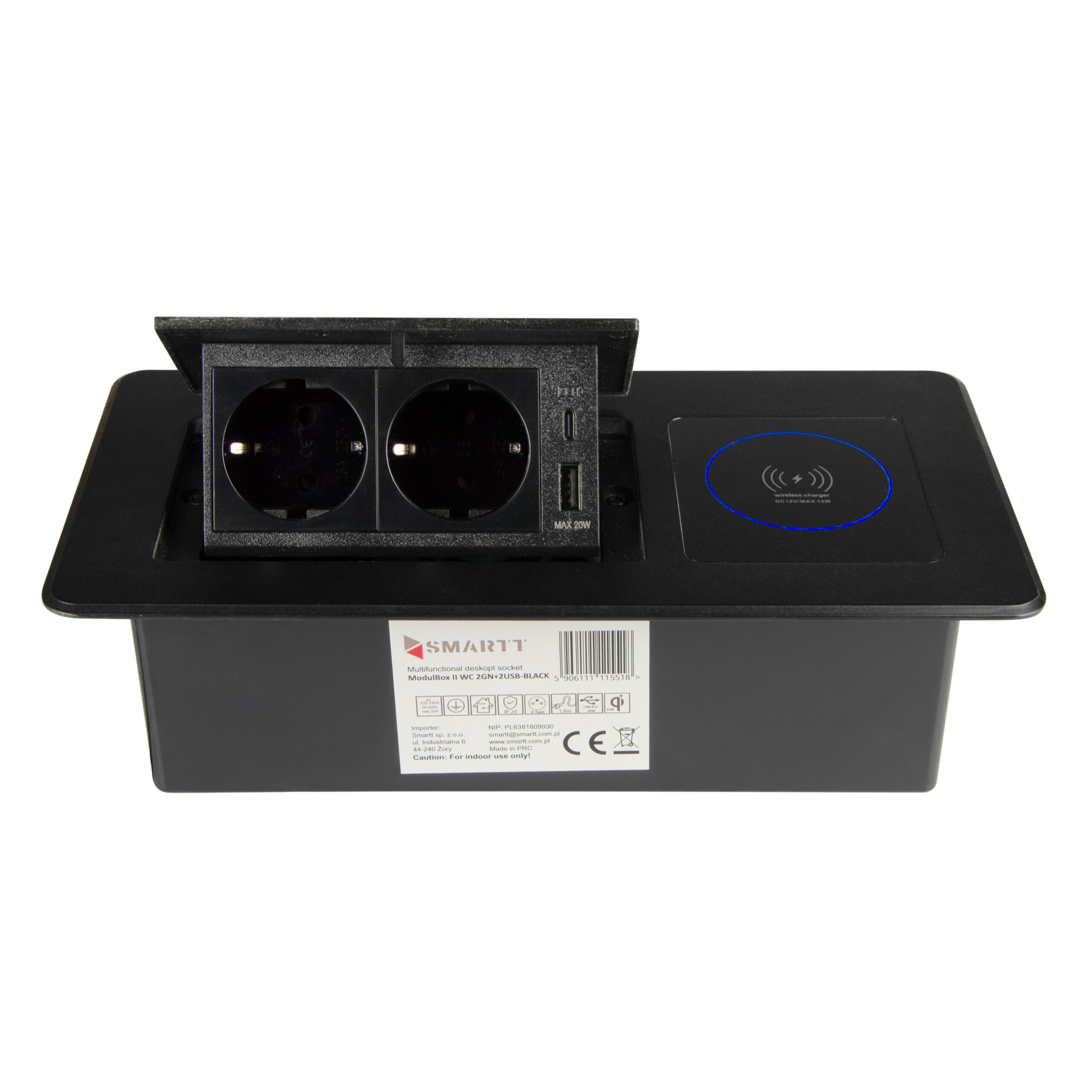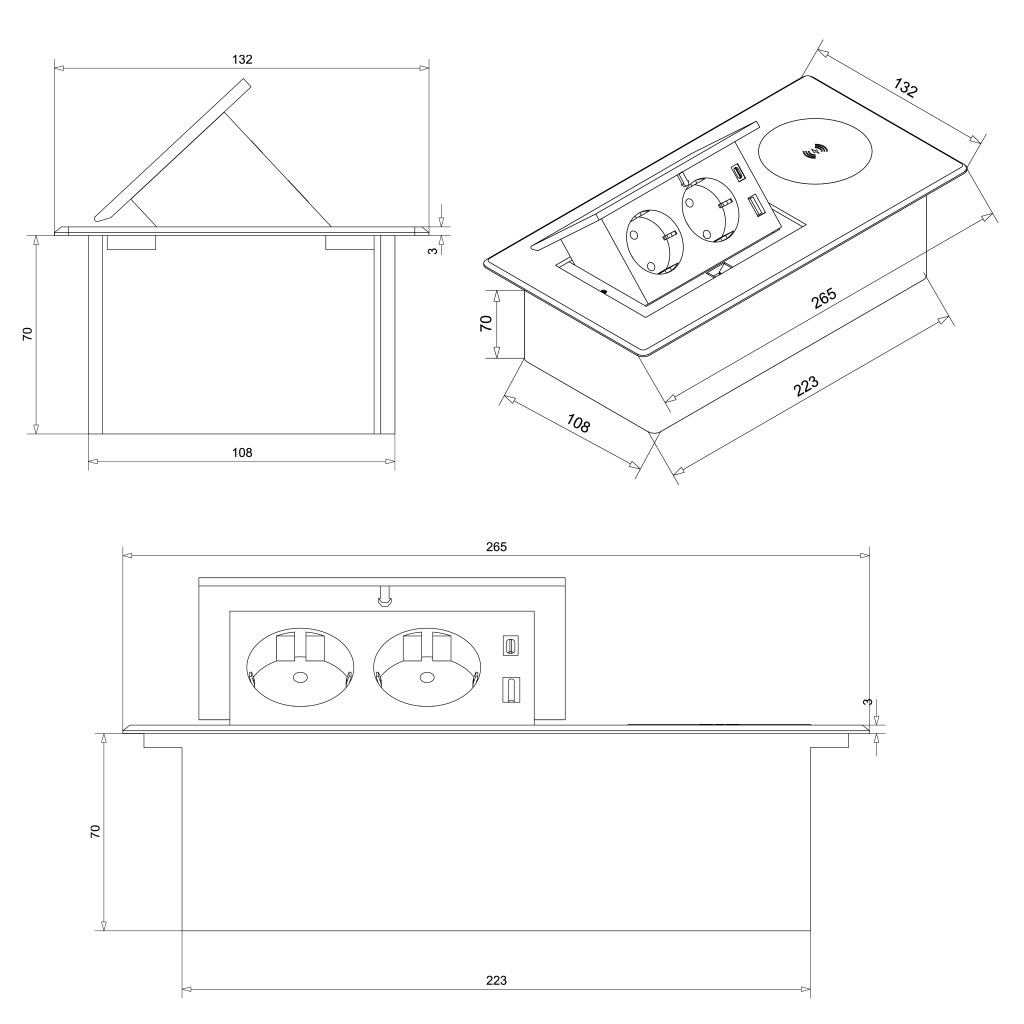 Versenkbare Einbausteckdose Modulbox II Schwarz – 2x Schuko, USB-A/C 20W, Induktion 15W