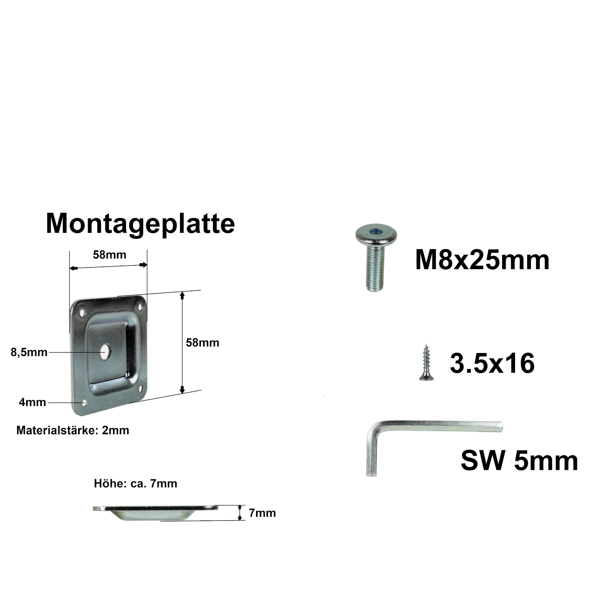 - Montageplatten 58×58×2 mm: verzinkter Stahl, universell einsetzbar