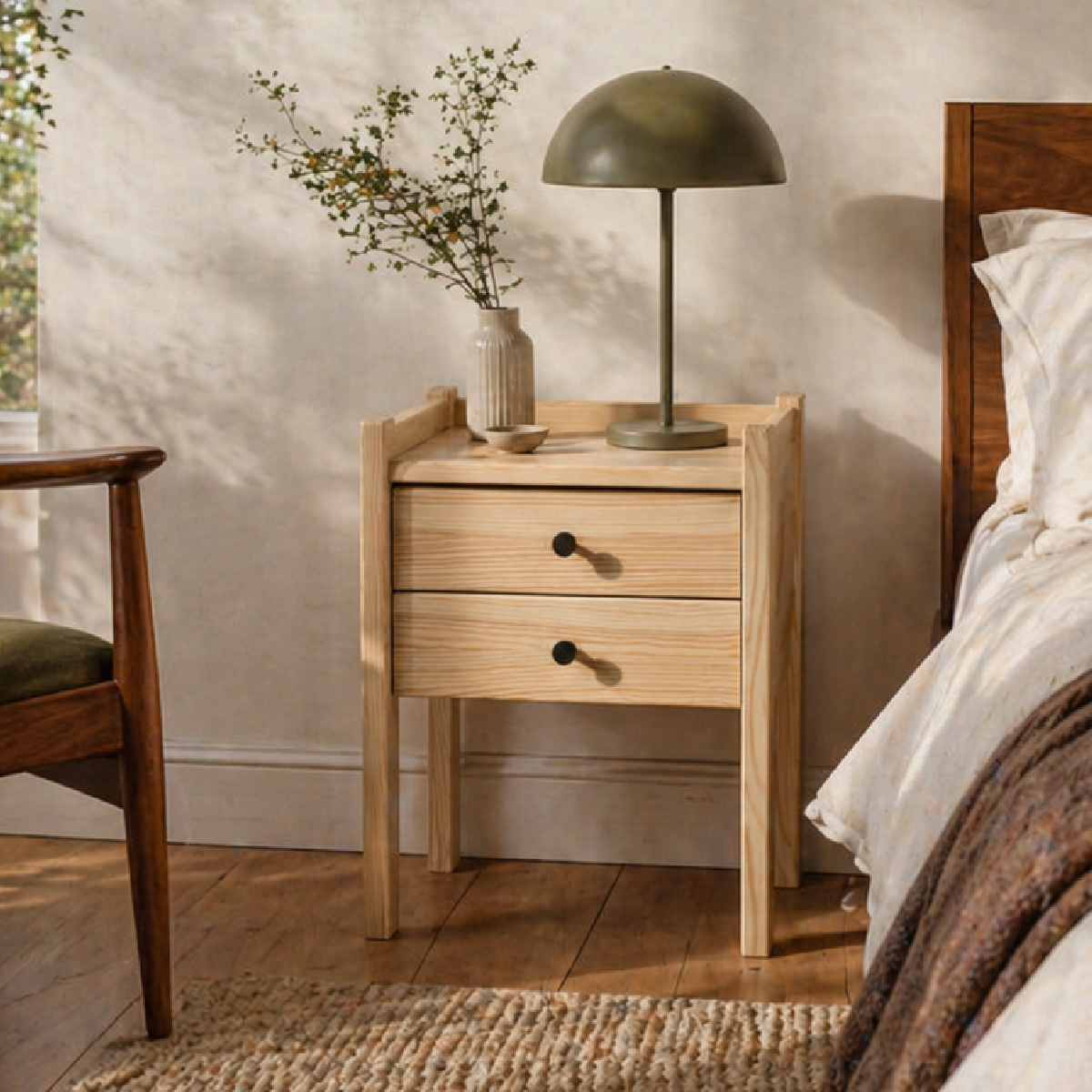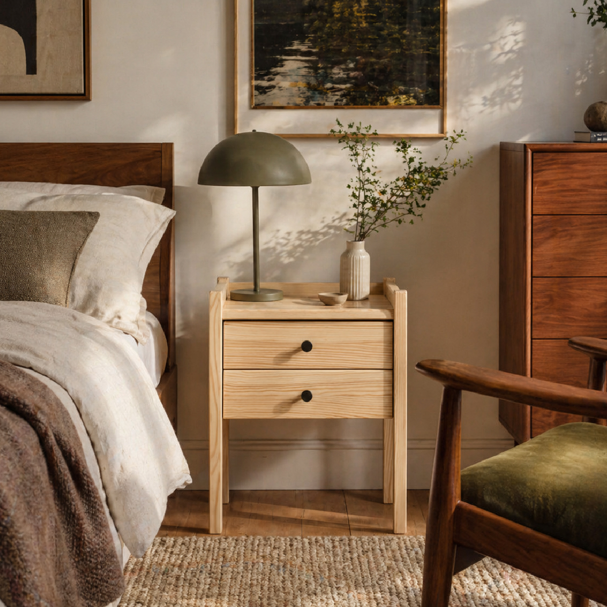 Ist das Holz behandelt? Ja, der Nachttisch ist hochwertig verarbeitet, um die natürliche Textur zu schützen und gleichzeitig pflegeleicht zu bleiben.