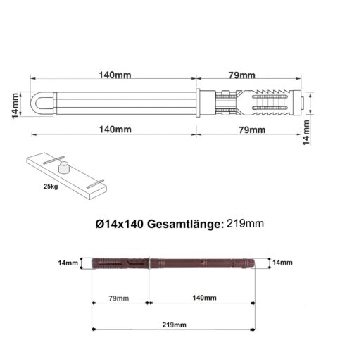 - Maße: Stift Ø 14 x 140 mm, Gesamtlänge ca. 219 mm