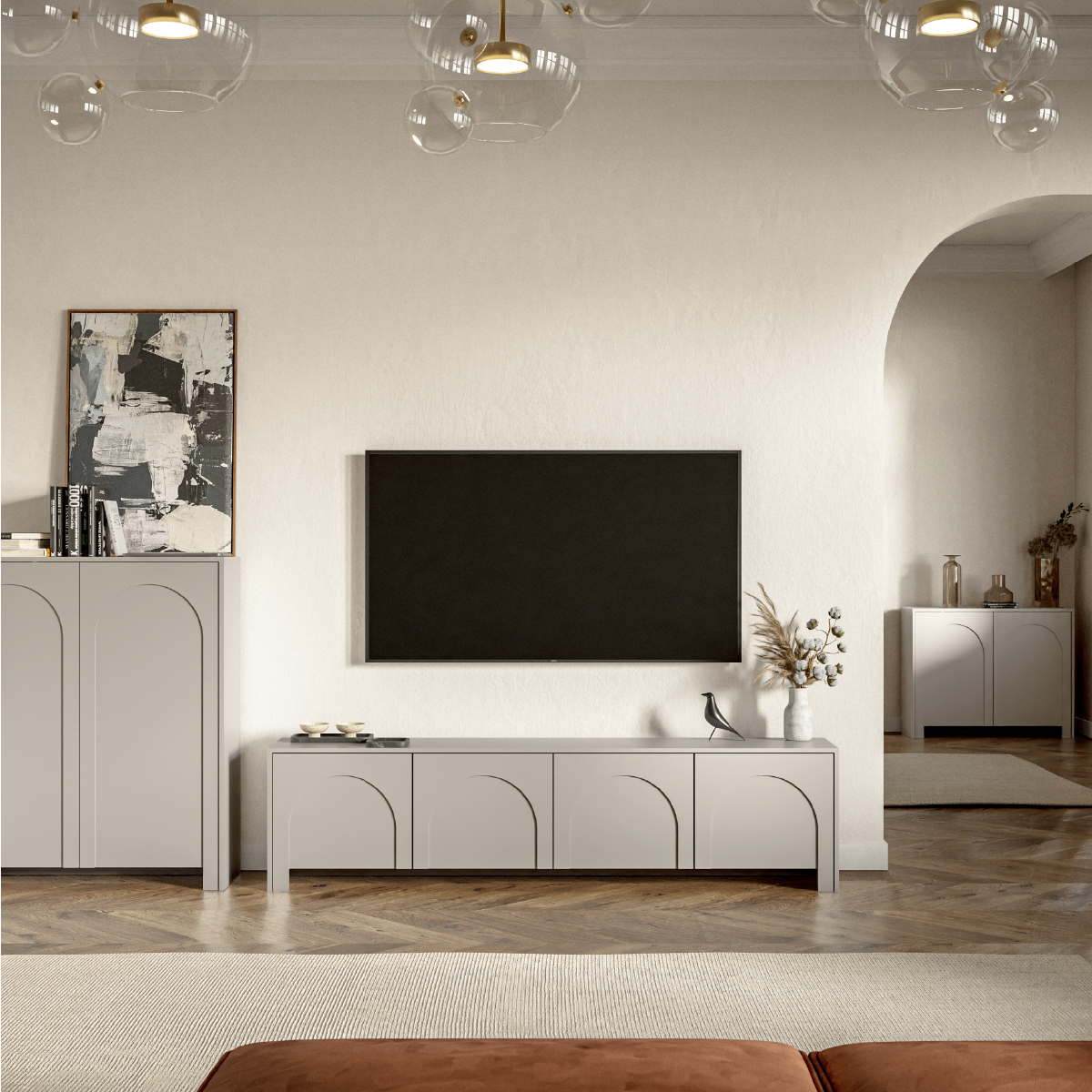Das TV-Board Kaschmir 200 cm aus der Vento-Kollektion ist die kinoreife Basis für Ihr Wohnzimmer. Mit einer optimierten Höhe von nur 51 cm bringt es Ihren Fernseher auf die perfekte Sichthöhe, während die vier Bogenfronten für ein luxuriöses Design-Statement sorgen.
