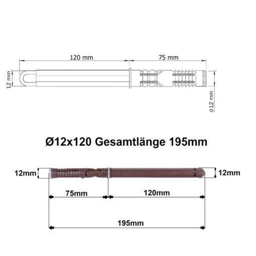 • Maße: Stift Ø 12 x 120 mm, Gesamtlänge ca. 195 mm