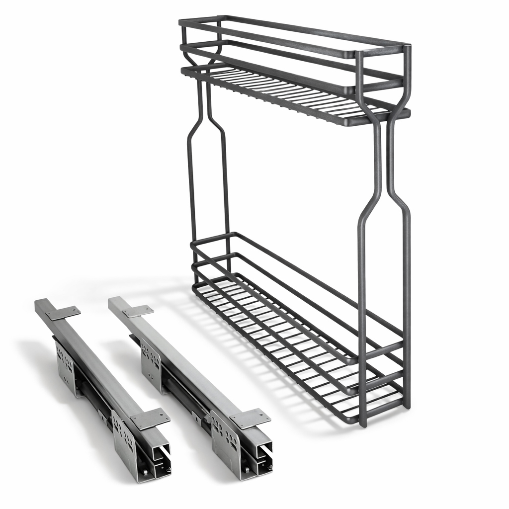 Unterschrank Auszug (150mm, Links) ist die ideale Lösung für schmale Küchenschränke. Dank der Montage an der linken Seitenwand nutzen Sie Nischen perfekt aus, um Ölflaschen, Gewürze oder Vorräte griffbereit zu verstauen.