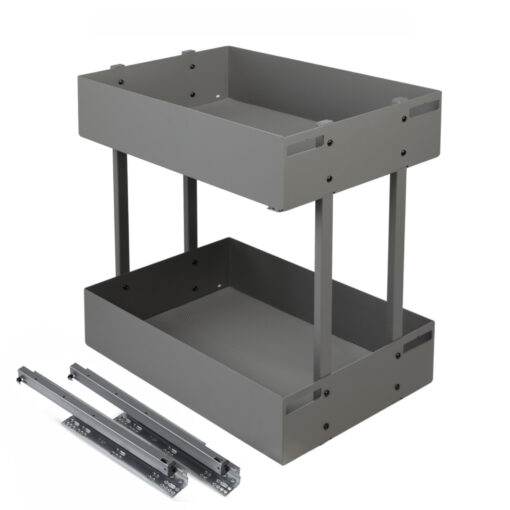 Mit diesem Unterschrankauszug mit 2 Etagen und Softclose schaffen Sie Ordnung in der Küche – schnell und ohne großen Aufwand. Der Auszug passt in Unterschränke von 25 cm bis 60 cm Breite (Varianten ansehen) und wird direkt im Schrankboden montiert.