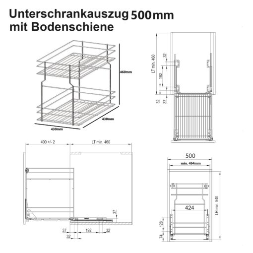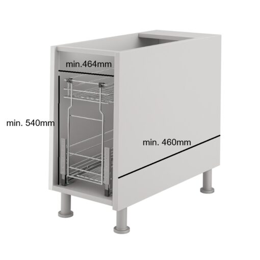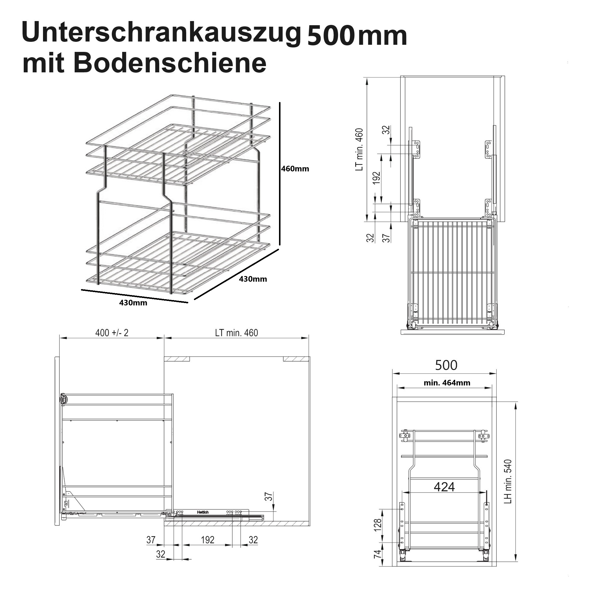 Der Unterschrankauszug 50 cm nutzt schmale Nischen optimal: 2 Etagen, Vollauszug und gedämpftes Schließen. Verchromter Drahtkorb, passgenau ab 46,4 cm Innenbreite.