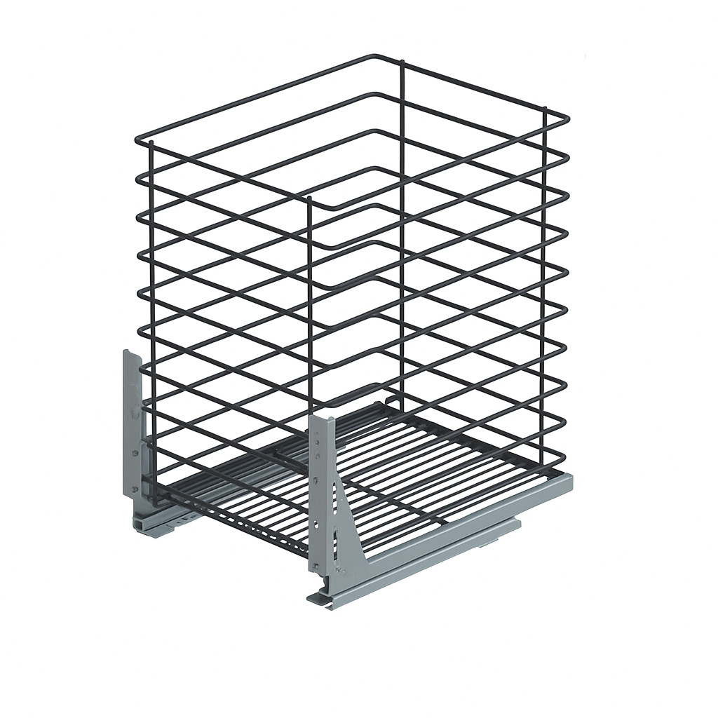 Der Unterschrankauszug Bodenmontage ist ein einetagiger Auszugskorb aus pulverbeschichtetem Stahl für 30–60 cm breite Unterschränke. Er eignet sich für Küche, Bad oder Hauswirtschaftsraum und schafft übersichtlichen Stauraum für Vorräte, Flaschen oder Reinigungsmittel. Der hohe Korb verhindert das Umfallen des Inhalts, während der Soft-Close-Vollauszug ein leises und kontrolliertes Einfahren gewährleistet.