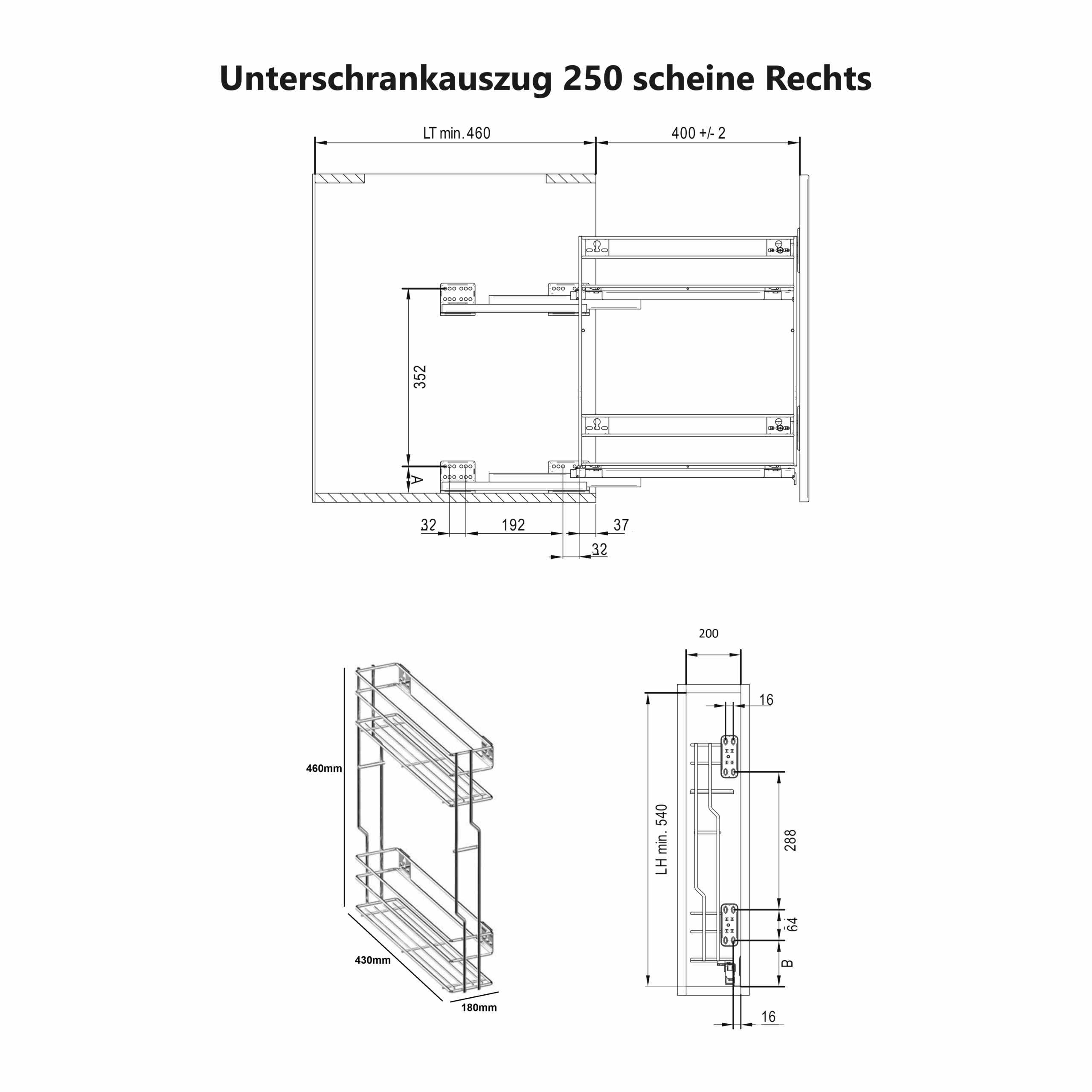 ✅ 250mm: Mindest-Innenmaße : B 214 mm × T 460 mm × H 540 mm