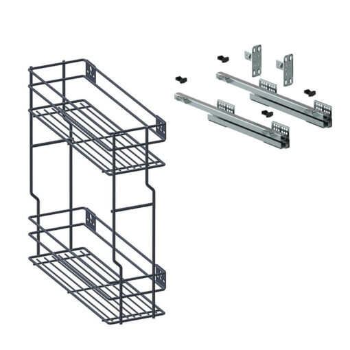 Dieser Küchenorganizer Auszug wurde für schmale Küchenschränke entwickelt und bietet maximale Raumnutzung auf zwei stabilen Ebenen. Die Soft-Close-Führung sorgt für leises, kontrolliertes Einfahren, während die pulverbeschichteten Drahtkörbe in Anthrazit für hohe Stabilität und moderne Optik stehen. Die Montage erfolgt per Seitenmontage links oder rechts.
