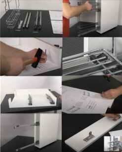 Die Installation erfolgt per Seitenmontage und ist dank Schablone schnell erledigt. Der Unterschrankauszug Küche 2 Ebenen eignet sich für Vorräte, Reinigungsmittel oder Küchenzubehör und schafft Ordnung auch in schmalen Unterschränken.