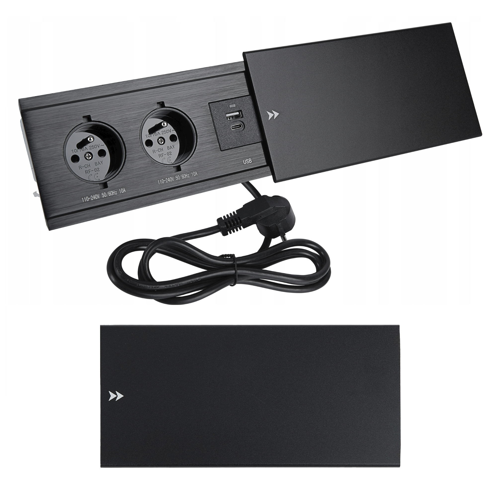 Versenkbare Einbausteckdose Schwarz mit Schiebedeckel ist die saubere Lösung, wenn Strom und USB direkt in der Tischplatte verfügbar sein sollen.