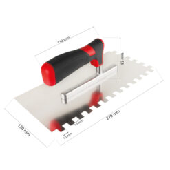 - Die Kelle 10×10 mm aus rostfreiem Edelstahl (0,7 mm) verteilt Fliesenkleber und Mörtel gleichmäßig; das Blattmaß 270 x 130 mm und der ergonomische Softgriff (130 x 83 mm) ermöglichen präzises Arbeiten an Wand und Boden – innen wie außen