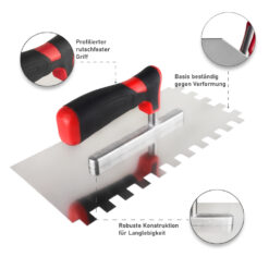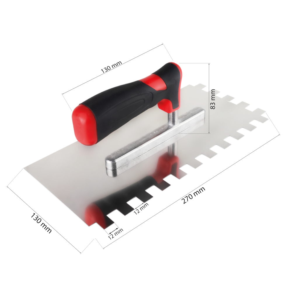 - Die Kelle 12×12 mm aus rostfreiem Edelstahl (0,7 mm) verteilt Fliesenkleber und Mörtel gleichmäßig; das Blattmaß 270 x 130 mm und der ergonomische Softgriff (130 x 83 mm) ermöglichen präzises Arbeiten an Wand und Boden – innen wie außen